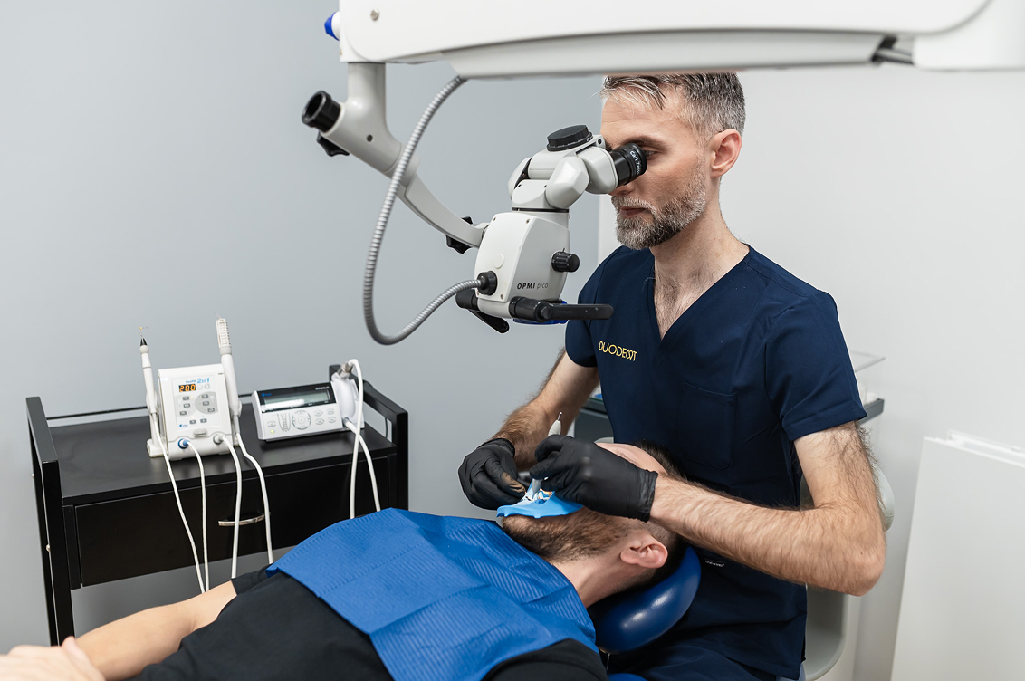 Niekiedy leczenie endodontyczne jest bardziej skomplikowane – szczególnie w przypadku nietypowej anatomii zęba, występujących wewnątrz zwapnieniach lub w sytuacji, gdy potrzebne jest tzw. reendo, czyli ponowne leczenie endodontyczne, gdy pierwsza próba leczenia skończyła się niepowodzeniem (np. złamaniem narzędzia lub rozwojem stanu zapalnego). W takich przypadkach konieczna jest dokładna diagnostyka i plan leczenia. Najlepszym badaniem jest wtedy tomografia wiązki stożkowej (CBCT), którą można wykonać w Duodent Nowolipki w rozdzielczości 75µm, która charakteryzuje się obecnie najwyższą dostępną dokładnością na rynku.